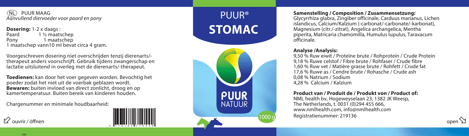 PUUR Stomac 1000gkan door het voer gegeven worden. Bevochtig het poeder zodat het niet uit de voerbak geblazen wordt.